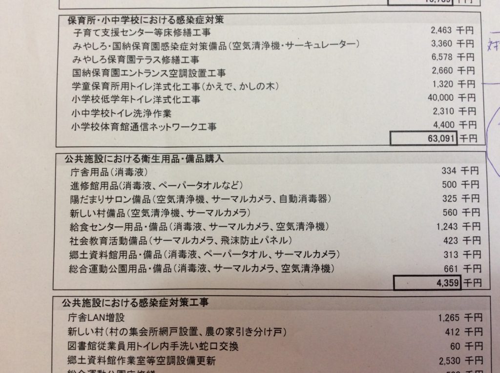 今回の代替案は上記の2案ですが、これ以外にも、生活支援、子ども見守り支援、経済対策、保育園、小中学校、公共施設の感染症対策など30の補助事業があります。