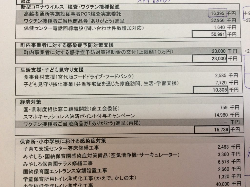 当初は、高齢者入所施設職員(特養、老健、有料老人ホームなど)だけでしたが、デイサービス職員にも費用補助を拡充。町内33カ所552名×3回分(5月、6月、7月)の予算です。